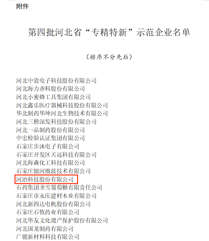 20211230日,河北省工業和信息化廳發布了《關于公布第四批河北省“專精特新”示范企業的通知》(冀工信企業函〔20211029號)。通過前期申報,河冶科技股份有限公司通過了市級、省級的嚴格審核,被認定為河北省“專精特新”示范企業。