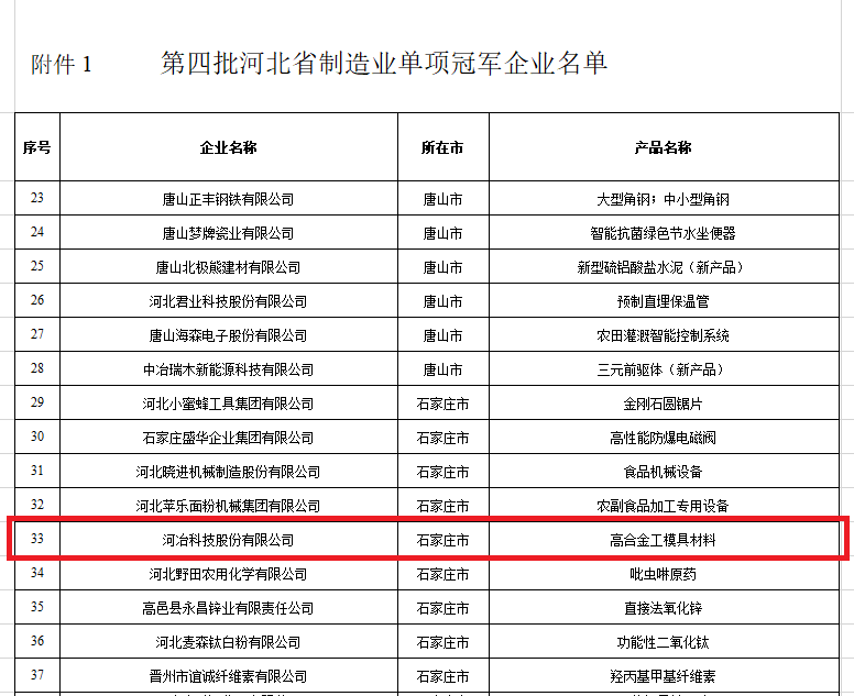 近日,河北省工業和信息化廳發布《關于公布第四批河北省制造業單項冠軍企業名單的通知 冀制強省辦〔202225號》。經企業申報、各市工信部門推薦、專家評審、現場抽查、公示,確定了河北省第四批制造業單項冠軍企業(產品)名單,通過公示期,河冶科技股份有限公司獲得河北省單項冠軍企業認定。